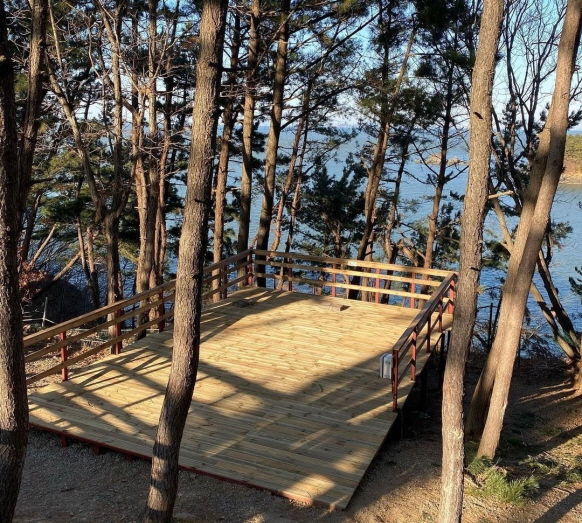 이점은 많이 아쉽더라구요.그래도 앵두랑 바다로 갈수있는 산책길이 있어서 앵두랑 바다를 보러 내려갔다왔어요. 바다로 가는길 말고도 작은산이랑 연결되어있는 산책길도 있었습니다.그래서 이쪽저쪽 산책을 많이할수있는 점도 좋았습니다.트리캠핑장에 체크인을 하러 인포에 가시면 온도체크를합니다.
